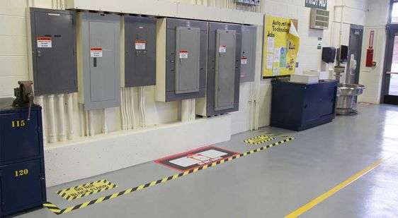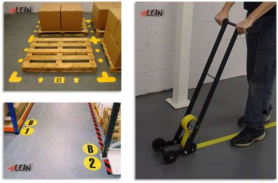 Pomaga wizualnie komunikować informacje pracownikom za pomocą kolorowych oznaczeń, etykiet i taśm podłogowych.