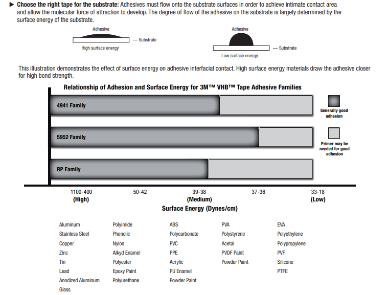 - Choose the right tape for the substrate: Adhesives must flow onto the substrate surfaces in order to achieve intimate contact area and allow the molecular force of attraction to develop. The degree of flow of the adhesive on the substrate is largely determined by the surface energy of the substrate.