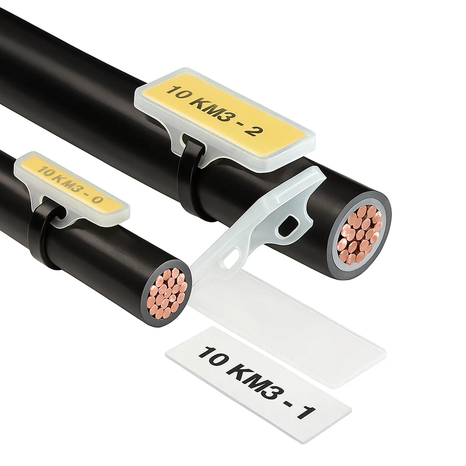 Skaidrus konteineris tvirtinamas prie laido kabelių dirželiu, o į uždaromą dalį įdedama etiketė arba įdėklas.